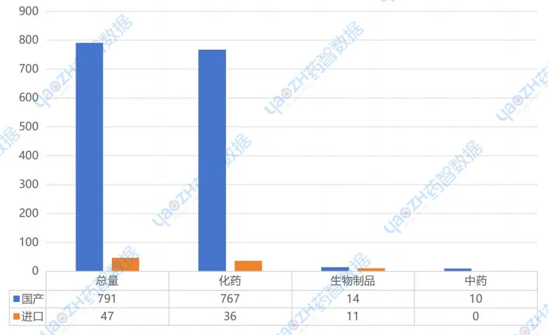 2025年1-4月上市的838个品种中,有791个国产药品和47个进口药品,其中化药品种803个、生物制品25个和中成药品10个。