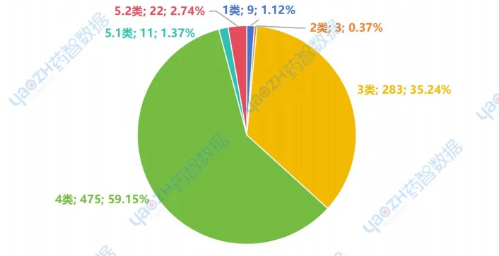 上市的仿制药品,主要以4类申报上市,有475个品种,其中拜耳医药的利伐沙班片为原研地产化品种,被纳入原研药品统计;其次是3类,共有283个品种上市,5.2类进口药品有22个品种。