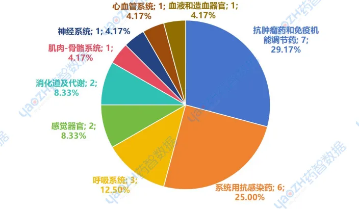 2025年1-4月上市的24个化药原研品种,其治疗领域广泛,主要是抗肿瘤和免疫机能调节药品,有7个品种;其次为系统用抗感染药,有6个品种;呼吸系统有3个品种,感觉器官和消化道及代谢用药各2个品种;其余的神经系统、心血管系统、血液和造血器官用药,各有1个品种上市。
