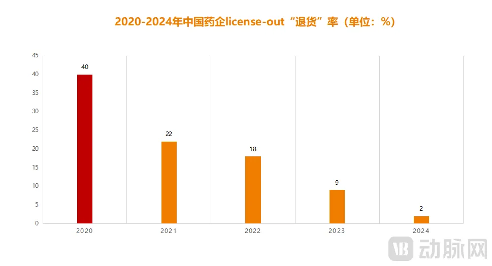但任何事物都有两面性,BD失败的消息同时也在传来。据动脉网不完全统计,截至2025年4月20日,在2020年已完成的62起license-out交易中,目前有25起已明确终止合作,“退货率”为40%。而2021年和2022年的“退货率”当前也已来到20%左右,并且有不少都是在今年宣布“分手”,比如诺诚健华的奥布替尼以及石药集团的ADC项目EO-3021等。