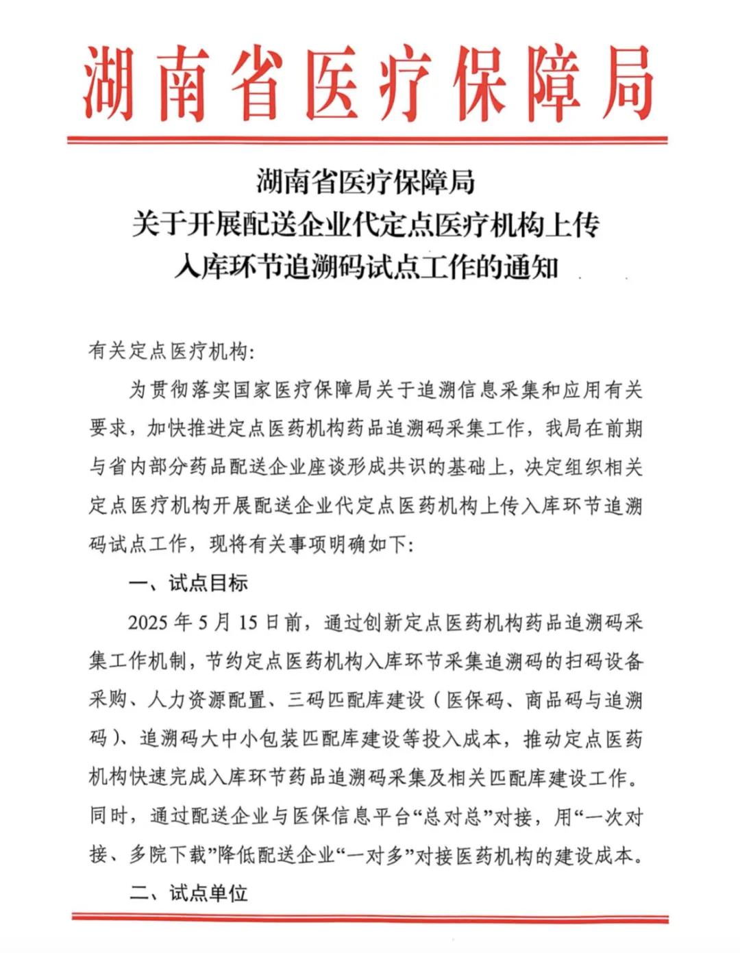 附:湖南省医保局《关于开展配送企业代定点医疗机构上传入库环节追溯码试点工作的通知》