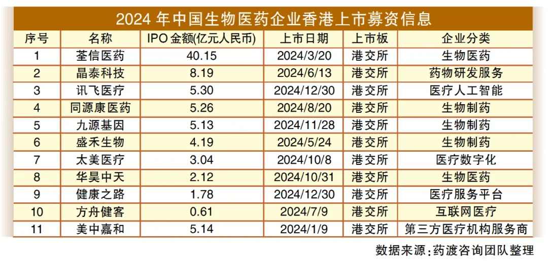 从总的数据看,2024年国内生物医药企业IPO热度持续降低,其中IPO总家数减少10家,募资总金额较2023年减少50%以上。2023年有21家医药生物企业在A股上市,2024年则降到了6家,上市数量和募资金额均明显下滑。更多的医药企业选择了港股市场,国内药企港股IPO数量从2023年的5家增多到2024年的11家,不过募资总额远不及2023年的285.82亿港元——2023年仅京东健康单个IPO就募资264.57亿港元。也就是说,除京东健康外,其他港股上市企业2023年共募资21.25亿港元,2024年港股融资额对比2023年实际上有大幅度提高,港股市场已重回全球第四大募资池。