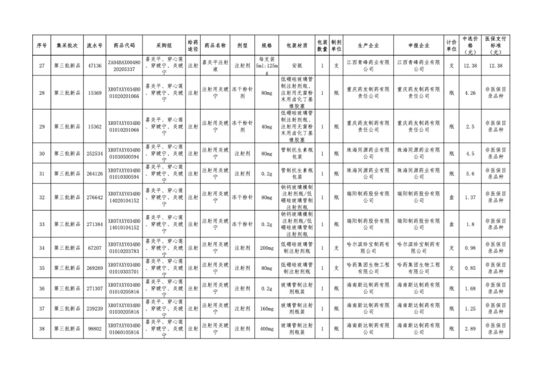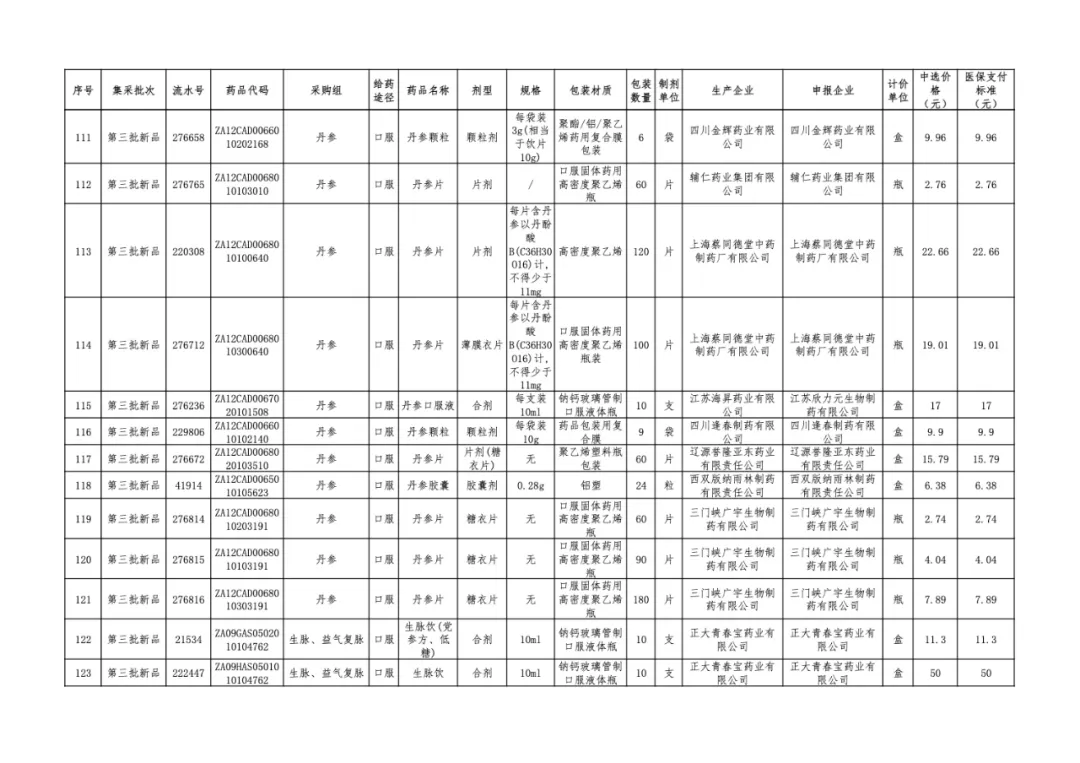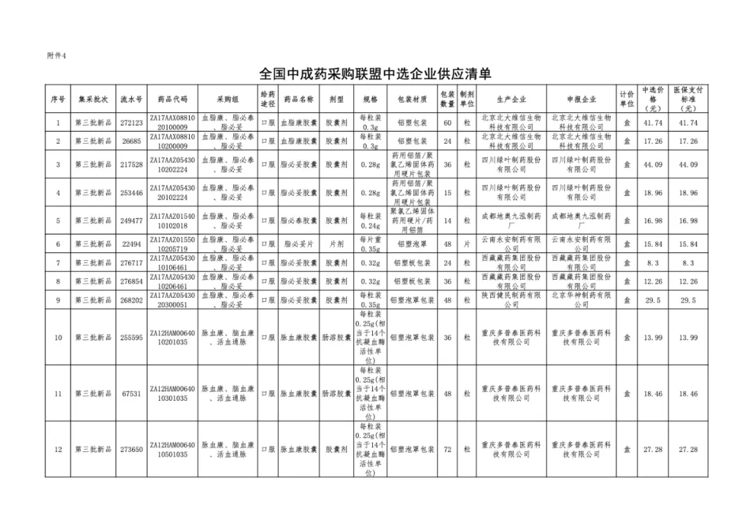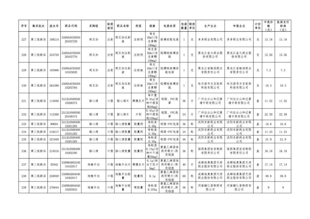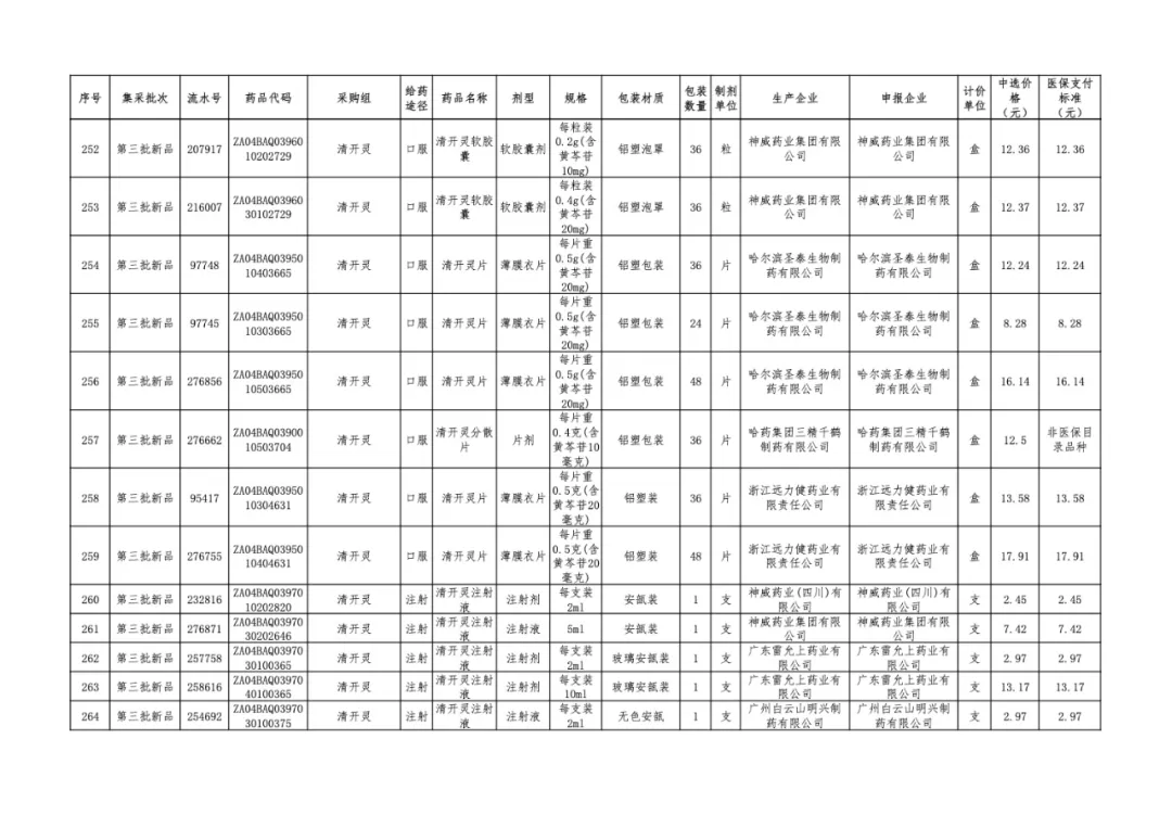 另外根据湖北官方发布的消息,独家药品拟中选率约33%,包括白云山的清开灵颗粒、青峰的喜炎平注射液、太极的益气复脉颗粒等最终中选——在第三批全国中成药集采的95个产品中,独家品种达38个。