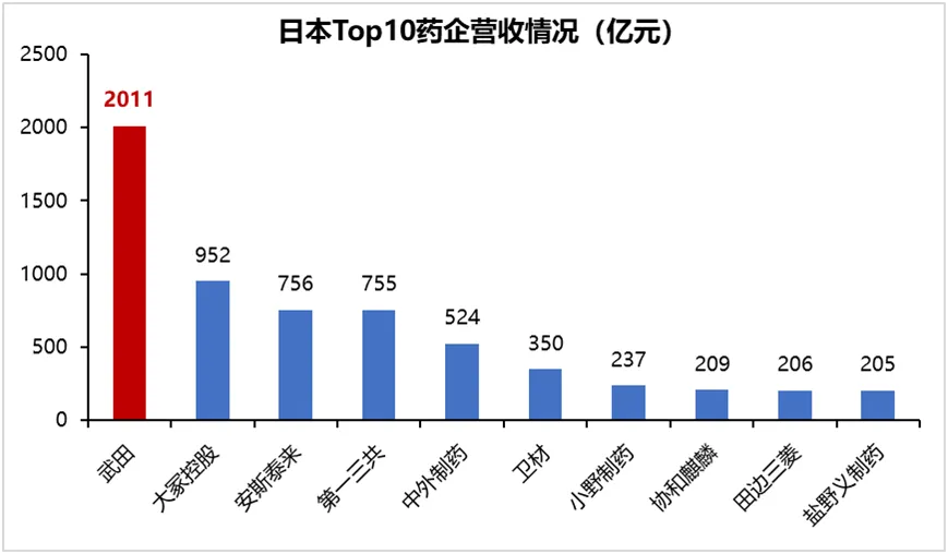 在历经行业震荡与洗礼后,日本本土药企如大浪淘沙,形成了少数龙头药企跻身国际医药巨头行列、多数药企表现平平的局面。其中,武田制药常年稳坐营收龙头的位置。大冢、安斯泰来、第一三共、中外制药、卫材、小野、协和麒麟、天边三菱、盐野义等与武田一起构成了日本药企TOP10。