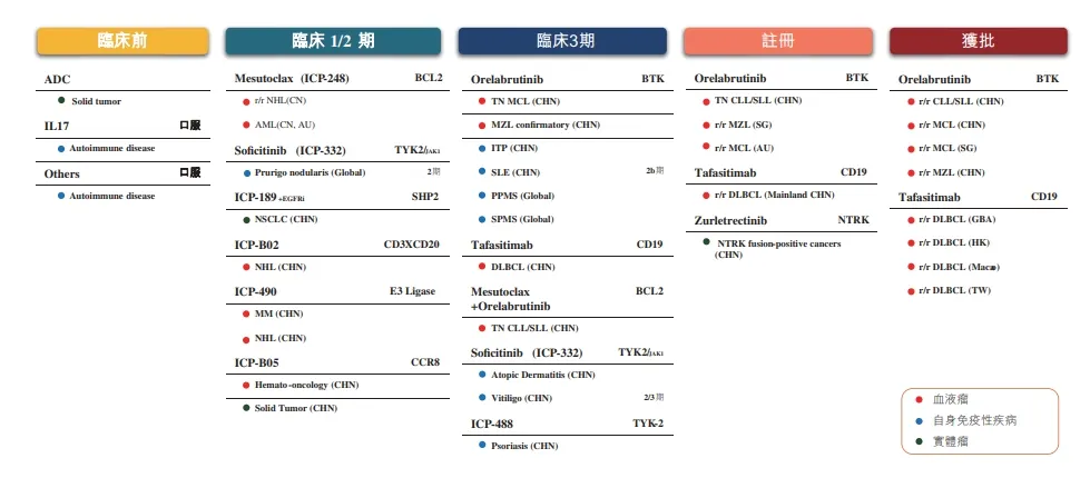 去年底的线上业绩交流会上,诺诚健华董事会主席兼行政总裁崔霁松就曾透露,预计2028年将可实现至少6款商业化产品,包括坦昔妥单抗、ICP-723、奥布替尼自免疾病适应症、ICP-248、ICP-332、ICP-488等管线。