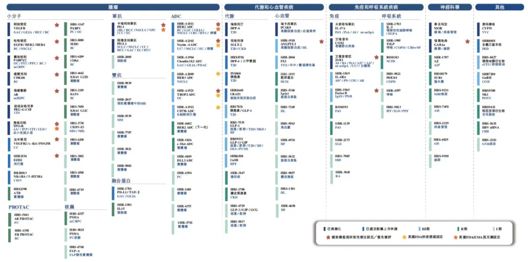 具体来说,恒瑞医药专注于具有重大未满足医疗需求和显著增长潜力的治疗领域,就肿瘤领域,将产品组合从实体瘤拓展至血液恶性肿瘤,并实现从新辅助、辅助到后线治疗的全方位覆盖;同时布局主要的慢性疾病,包括代谢和心血管疾病、免疫和呼吸系统疾病以及神经系统疾病,提供从预防到治疗的治疗方案。