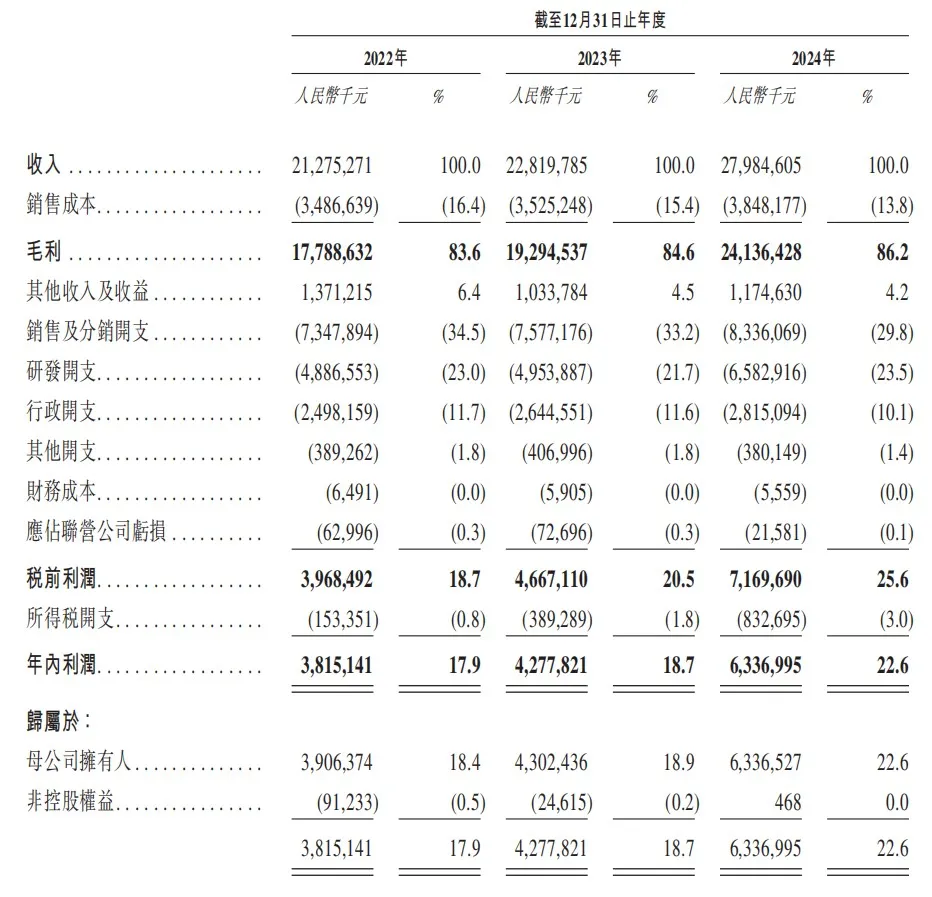 财务方面,恒瑞医药2024年的总收入为280亿元,自2014年起的复合年增长率约为14%;毛利由2023年的192.95亿元增加至2024年的241.36亿元,毛利率由2023年的84.6%升至2024年的86.2%。