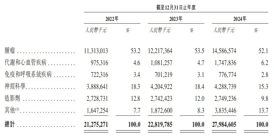 恒瑞医药分治疗领域的收入结构