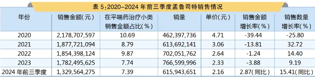 从在平喘药治疗小类销售金额的占比来看,孟鲁司特销售金额占比是呈下降的态势,2020-2023年的销售金额占比分别为10.69%、8.79%、9.87%和7.74%。2024年前三季度销售金额占比为7.39%。从销量来看,近5年也是增长的。