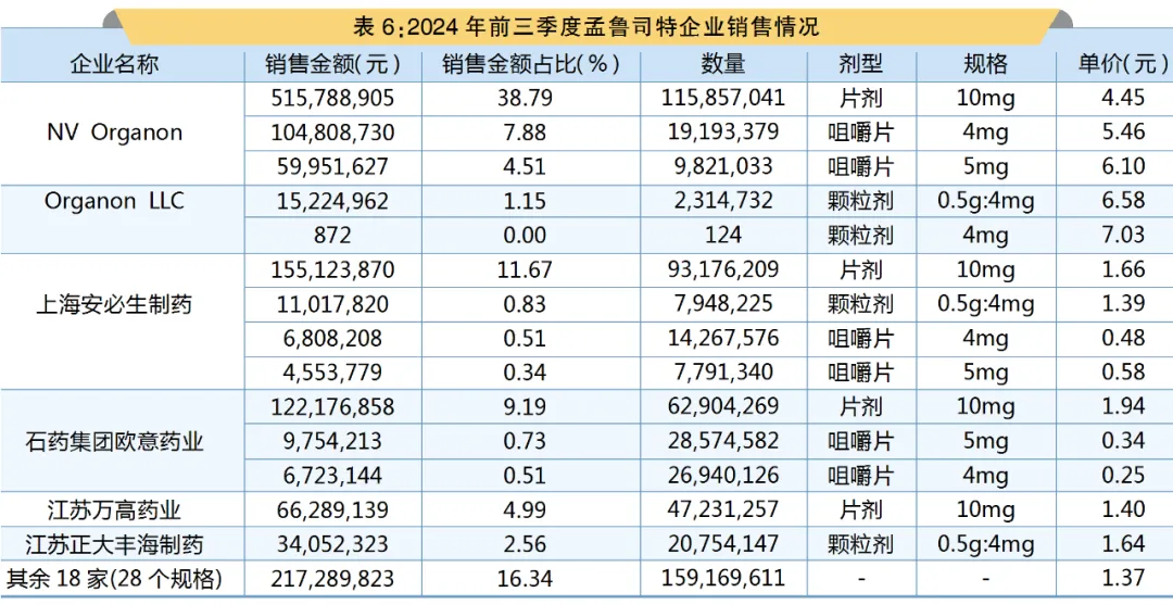 PDB数据显示,在2024年前三季度,国内全渠道孟鲁司特制剂销售额为13.30亿元。
