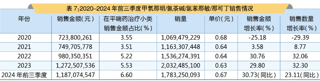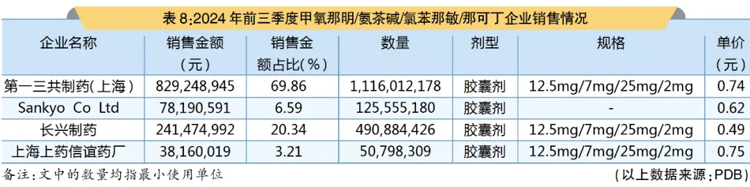 PDB数据显示,在2024年前三季度,国内全渠道甲氧那明/氨茶碱/氯苯那敏/那可丁制剂销售额为11.87亿元。