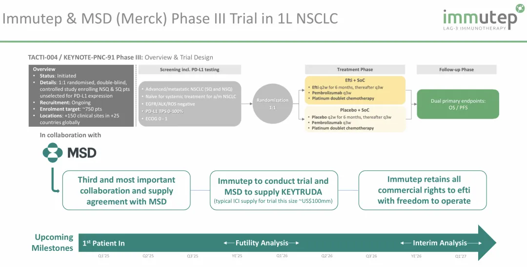 除了最新公布的1L HNSCC总生存期数据外,efti目前已经启动全人群1L NSCLC临床III期,旨在探索efti+K药+化疗与K药+化疗+安慰剂组的头对头疗效与安全性的比较,预计将在2026年底到2027年中进行期中分析。