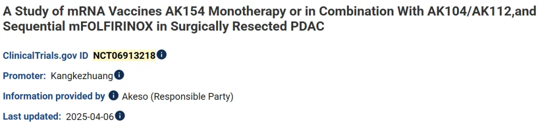 近日,康方生物在Clinicaltrials.gov网站上注册了个体化mRNA疫苗单药或联合PD-1/CTLA-4双抗、PD-1/VEGF双抗辅助治疗胰腺癌的IIT临床试验。