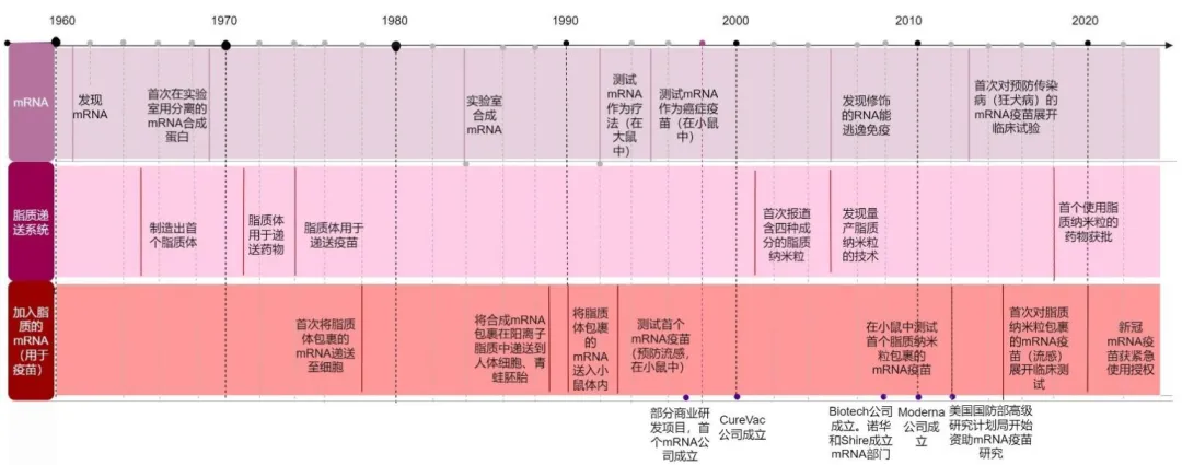 mRNA自上世纪60年代被发现后,历经实验室合成、体外修饰、逃逸免疫检测、与脂质纳米体递送系统结合等多个发展时期。至今,mRNA疫苗已获批新冠疫苗品种。