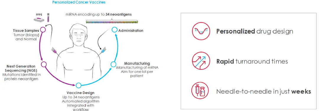 Moderna的个体化疫苗mRNA-4157(V940)已进入Ⅲ期临床,mRNA-4157(V940)属于一种mRNA个体化新抗原疗法,由编码多达34种新抗原的单一合成mRNA组成,其所针对的新抗原是根据每位患者肿瘤独特的DNA序列突变特征通过算法设计而成,可以激活肿瘤新生抗原的特异性T细胞,进而杀伤肿瘤细胞。