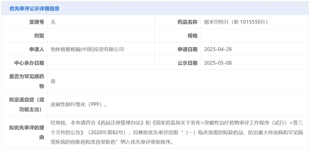5月8日,国家药品监督管理局药品审评中心(CDE)网站显示,勃林格殷格翰的那米司特片(nerandomilast)拟纳入优先审评,适应症为进展性肺纤维化(PPF)。