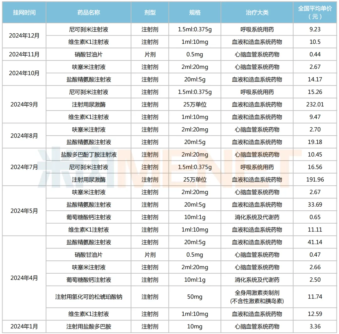 据不完全统计,2024年至今共有10款短缺药的全国平均价拟公示,其中“上榜”次数较多的品种为:呋塞米注射液、盐酸精氨酸注射液和维生素K1注射液,分别达到4次;按治疗大类统计,心脑血管系统药物、血液和造血系统药物各以4个和3个产品在数量上领跑。