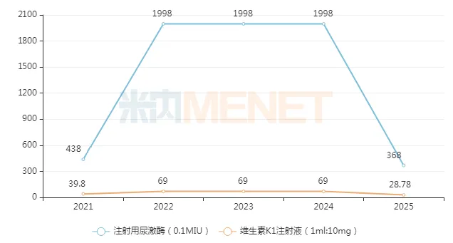 从药品招投标情况分析,注射用尿激酶(0.1MIU)、维生素K1注射液(1ml:10mg)2022-2024年全国最高中标单价分别达1998元/支和69元/支。经过国家及地方持续对临床(易)短缺药挂网价格的监控,不断强化各地挂网产品价格联动机制,2025年以来,上述2款短缺药全国最高中标单价已分别回落至368元/支和28.78元/支,这对广大患者而言无疑是一大福音。