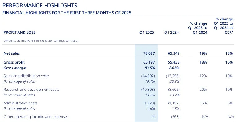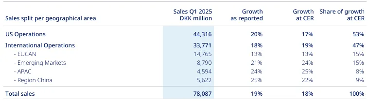 按地域分布来看,2025Q1美国市场收入443.16亿丹麦克朗(约63.65亿美元,+17%),美国外市场收入337.71亿丹麦克朗(约48.51亿美元,+19%),其中中国市场收入56.22亿丹麦克朗(约8.07亿美元,+22%)。