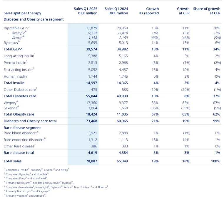 总体来看,今年一季度诺和诺德糖尿病和肥胖护理业务收入734.68亿丹麦克朗(约105.52亿美元,+19%),其中GLP-1类糖尿病药物收入395.74亿丹麦克朗(约56.84亿美元,+11%),胰岛素类产品收入149.97亿丹麦克朗(约21.54亿美元,+3%),肥胖症药物收入184.24亿丹麦克朗(约26.46亿美元,+65%)。此外,罕见病业务收入46.19亿丹麦克朗(约6.63亿美元,+3%)。