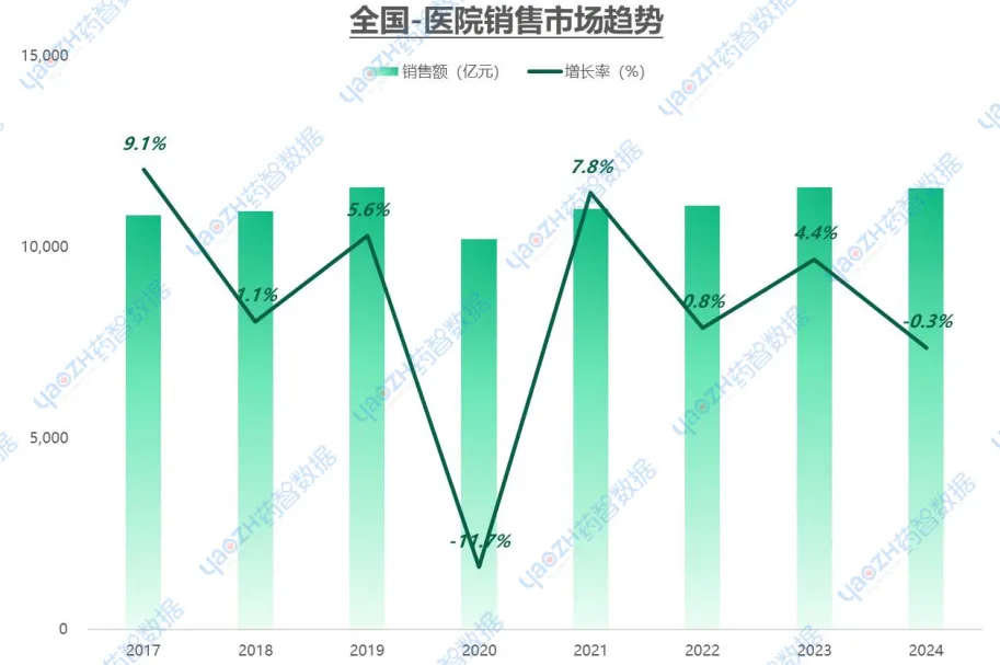 2024年,全国医院端药品市场总销售额达到11535亿元,同比下降 0.3%。是近四年来的低点也是自疫情后市场恢复期以来的首次年度负增长。这可能预示着市场已从过去的增量竞争快速过渡到存量博弈阶段,医院端市场面临更为严峻的挑战,将步入以效益提升和结构优化为核心的深度调整与精细化运营新时期。