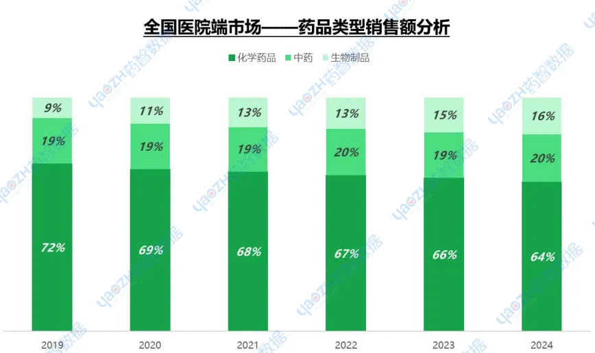 生物制品:实现显著增长,市场份额从2019年的9%持续攀升至2024年的16%,成为最具活力的增长引擎。