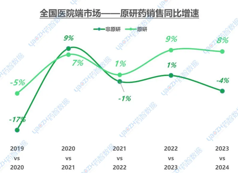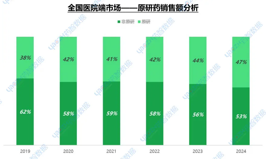 与此同时,原研药在市场中的重要性日益凸显。2024年,原研药销售规模占比已逐年提升至47%(相较于2019年的38%),销售额同比增长高达8%。这一趋势反映了临床对高质量、高疗效药品的持续需求以及价值医疗导向的增强。