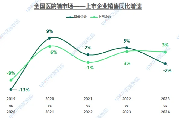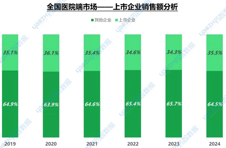 在企业层面,上市医药企业在医院端市场扮演着重要角色。2024年,上市企业的销售额合计占比达到35.5%,较2019年的35.1%和2023年的34.5%均有所提升,销售额同比增长 3%,显示其市场集中度及影响力在逐步增强。