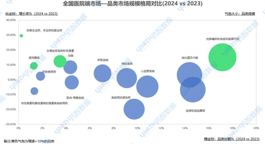 品类方面,2024年药品市场呈现显著的结构性增长特点:肿瘤治疗药物(抗肿瘤药和免疫机能调节药)表现最为突出,凭借超过15%的同比增长率,强势引领整体市场增长,其市场份额和规模均十分可观。生殖泌尿系统和性激素类药物以及感觉器官用药,在持续的市场需求支撑下,也保持了稳健的正向增长。