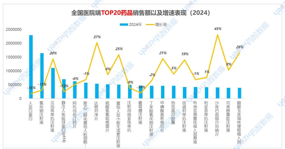 具体到TOP20品种,人血白蛋白、氯化钠注射液虽销售额居前,但增速放缓;而贝伐珠单抗注射液、达格列净片和沙库巴曲缬沙坦钠片等品种则凭借超过20%的同比增长,展现出强劲的增长潜力,预示着未来市场格局的动态变化。