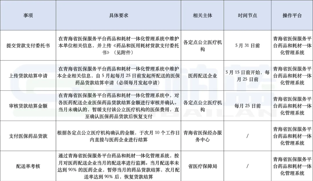 自2025年5月1日起,青海省医保服务平台药品和耗材一体化管理系统挂网的全部医保药品货款(含集采非医保药品),由青海省医保经办服务中心与医药企业直接结算。