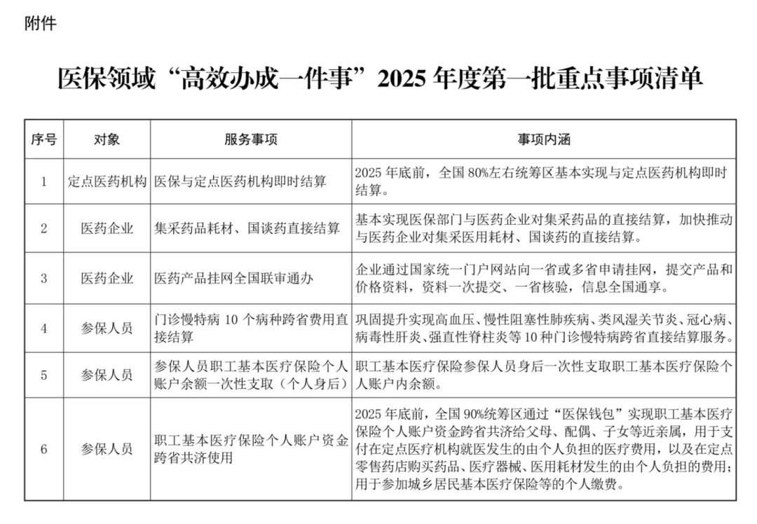 “2025年底前,全国 80%左右统筹区基本实现与定点医药机构即时结算”;“基本实现医保部门与医药企业对集采药品的直接结算,加快推动与医药企业对集采医用耗材、国谈药的直接结算”。