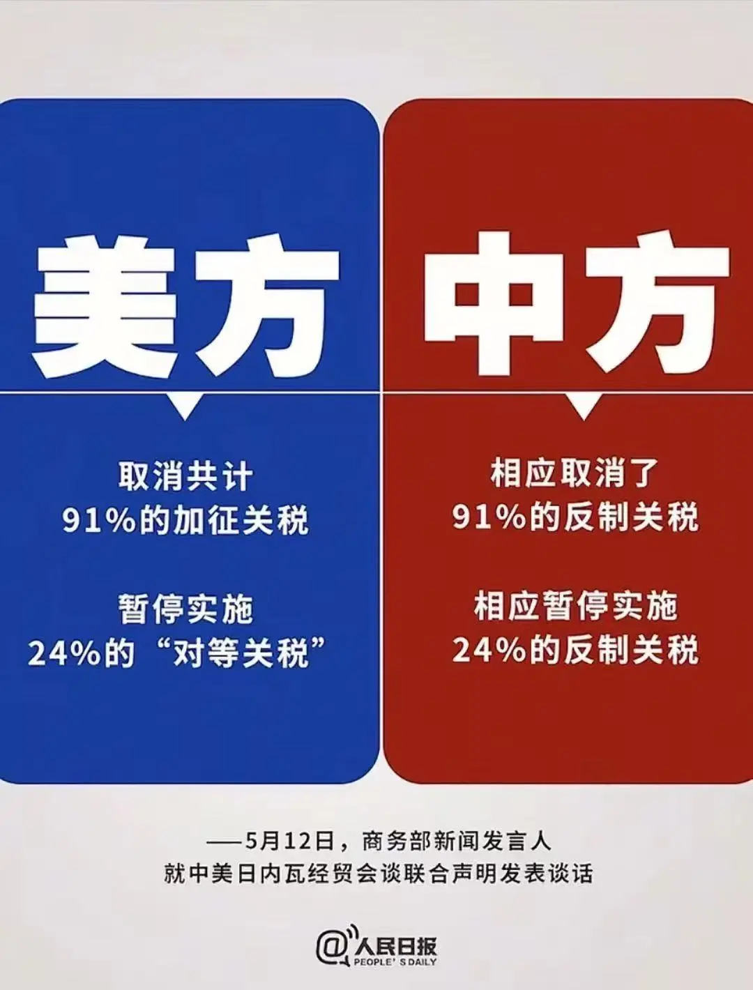 中美双方对4月以来的中美关税举措做了重大调整。双方举措对等:在5月14号前,取消91%加征关税,只保留10%关税。另外暂停实施24%关税,时限为90天。