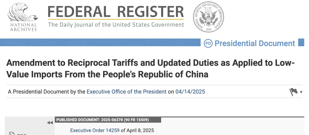 4月2日:特朗普宣布国家进入紧急状态,以解决他所说的“巨大且持续的美国贸易逆差”。同日,他签署第14257号行政令,宣布对约60个国家实施额外的“对等关税”。其中特别强调对中国商品的额外关税为34%,加上之前已对中国商品征收的20%关税,总计达到54%。*3月3日,白宫发布行政令,对2025年2月1日签发的第14195号令(针对中国合成阿片类药物供应链加征关税)进行第二次修订:认为鉴于芬太尼问题,中国尚未采取适当措施来缓解非法药物危机,特朗普将原定10%的对华进口商品惩罚性关税翻倍至20%,3月4日起生效。