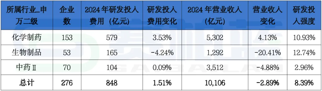 化学药制药行业统计到上市公司153家,2024年合计营业收入5302亿元,同比增长4.13%,研发投入费用共计579亿元,同比增长3.53%,和营业收入的变化幅度基本一致,研发投入强度10.93%;