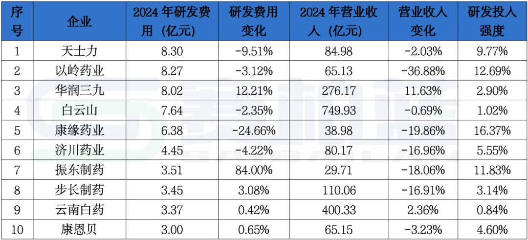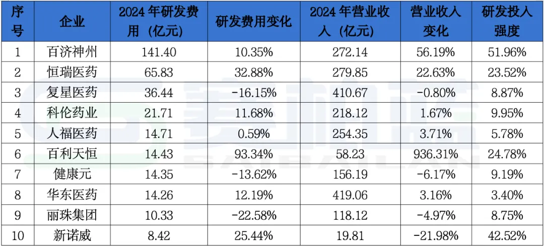 从研发费用投入变化来看,化学制药行业A股上市公司2024年研发费用投入TOP10企业中上升的有七家,下降的企业有三家。三家的研发投入费用下降的企业均出现了营业收入的下降,大多与研发管线聚焦收缩有关,如复星医药年报中提到研发体系整合提效。