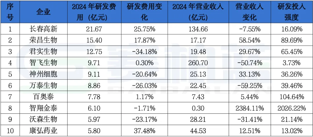 统计的53家生物制品企业中,入围研发投入费用TOP10的门槛在5亿元以上,营业收入在17亿元以上。其中研发投入费用最高的长春高新达到21.67亿元。