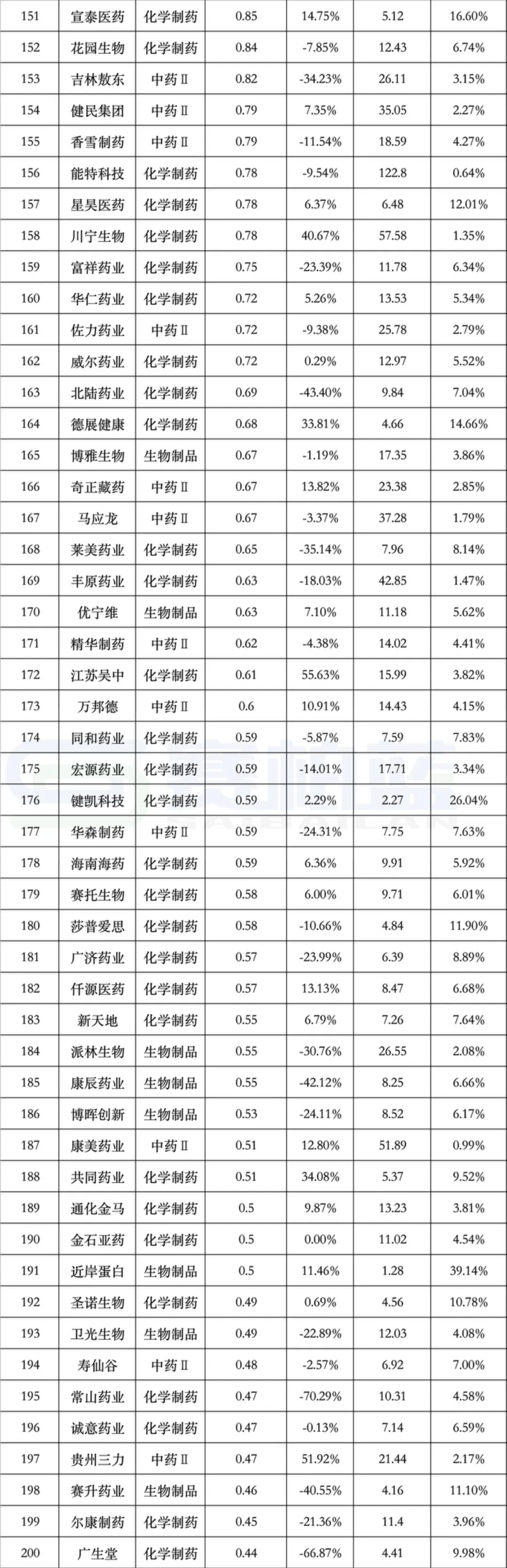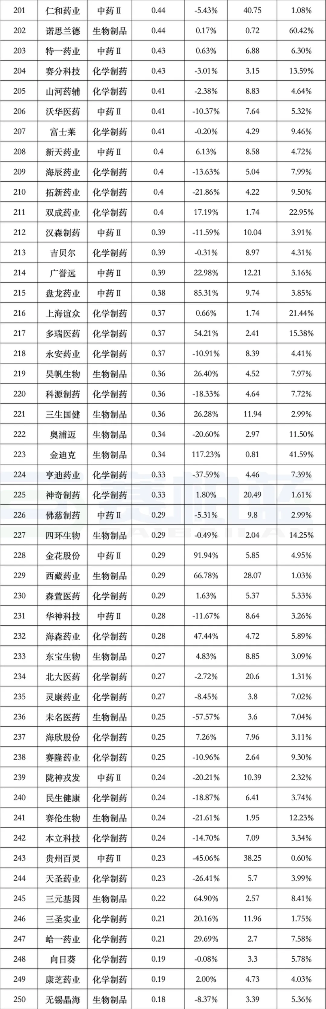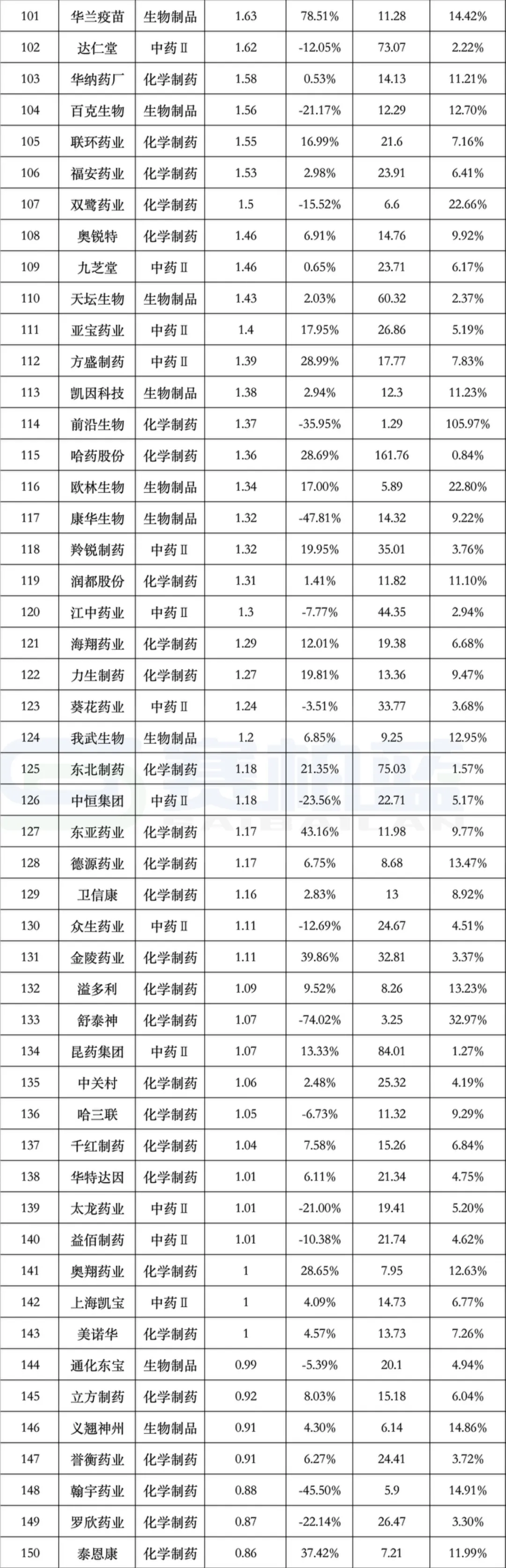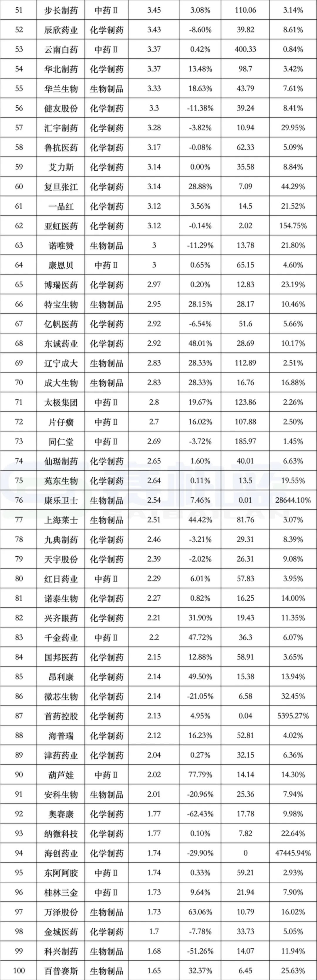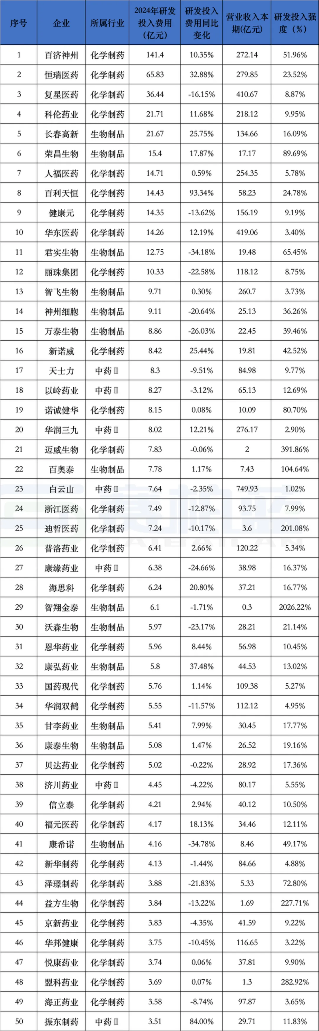 注:医药行业的类别根据巨潮资讯申万二级分类划分,以研发投入费用的大小排序,营业收入数据根据巨潮资讯网数据整理,研发投入费用根据上市公司年报手动整理。本文中所列研发投入金额有区分费用化投入和资本化投入的以费用化投入计,未分列的以年报中披露的研发费用投入计;有区分费用化投入和资本化投入的,研发投入强度以费用化投入与营业收入的比值计,未区分费用化投入和资本化投入的,以A股年报中披露的研发投入与营业收入的比值计,以下均同。数据供参考。