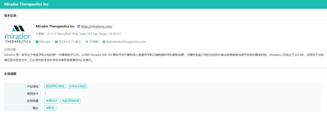 今年年初,有机构统计了2024年欧美生物制药领域融资排行榜,并指出“首轮融资成为最大规模交易的主要驱动力;自身免疫疾病领跑融资市场”。Mirador Therapeutics就是颇具代表性的一家,该公司专注于免疫学和炎症性疾病,在2024年3月以4亿美元的巨额A轮融资正式官宣亮相,在年度欧美biotech公司融资排行榜中位列第三。