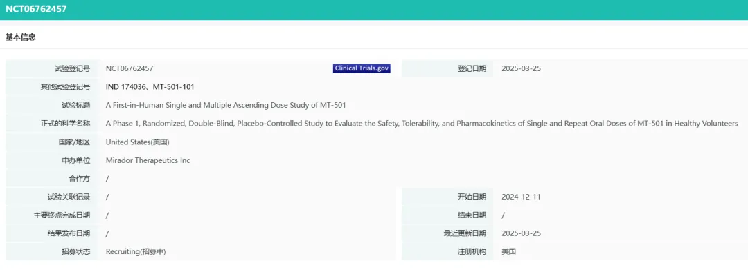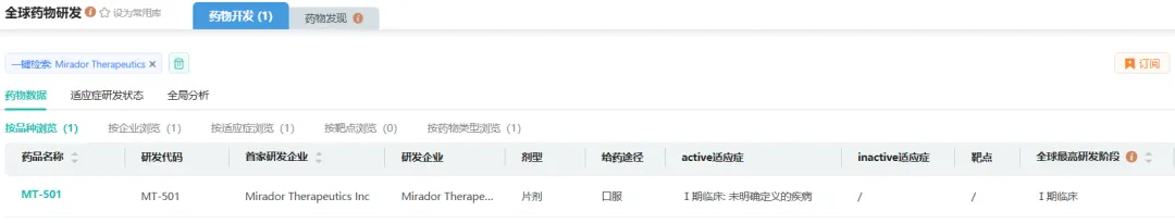 Mirador公司官网未披露在研管线情况,据摩熵医药数据显示,Mirador当前有一款候选药物,研发代号MT-501,靶点和适应症未知,是一种化药口服片剂,目前在美国处于1期临床阶段。临床登记号NCT06762457。