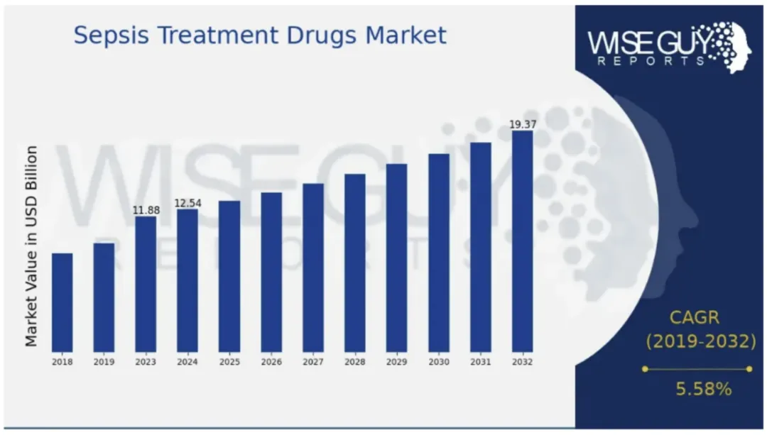 脓毒症领域缺乏有效治疗药物,目前抗生素类、免疫调节剂等传统药物为主,21世纪以来仅有重组活化蛋白C获批治疗脓毒症(后因疗效不确切撤市)。但由于脓毒症是美国住院患者的第一大死因(死亡率高达35% ~54%),并且中国每年约有近250万脓毒症患者,市场空间广阔;据Wise Guy Reports数据,2024年全球脓毒症治疗药物市场规模为125.4亿美元,预计到2032年市场规模将达到193.7亿美元,年均复合增长率为5.58%。