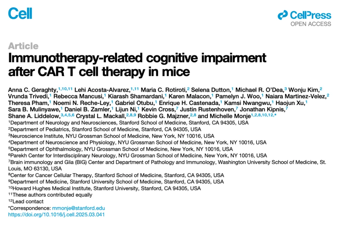 2025 年 5 月 12 日,斯坦福大学医学院的研究人员在国际顶尖学术期刊 Cell 上发表了题为:Immunotherapy-related cognitive impairment after CAR T cell therapy in mice 的研究论文。