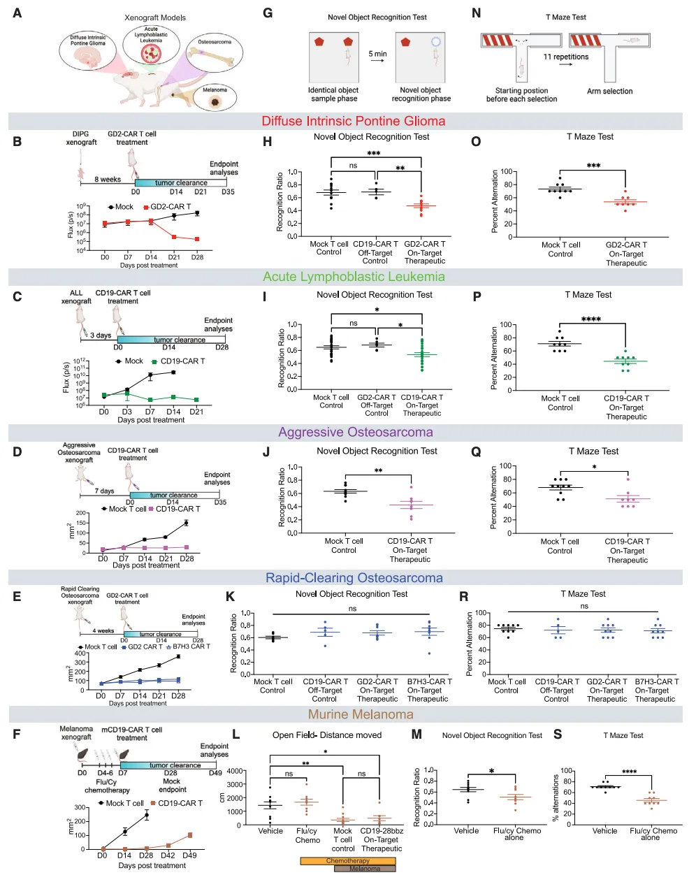 为了确定 CAR-T 细胞疗法是否会导致小鼠出现认知缺陷,研究团队使用了源自人类患者的中枢神经系统(CNS)和非中枢神经系统癌症的小鼠异种移植模型,以及免疫功能正常的非中枢神经系统癌症小鼠模型。这些模型包括 H3K27M+ 弥漫性内在脑桥胶质瘤(DIPG)、pre-B 细胞急性淋巴细胞白血病(ALL)、侵袭性骨肉瘤、快速清除性骨肉瘤以及黑色素瘤,选择这些模型是为了控制肿瘤位置,其中胶质瘤位于中枢神经系统内,白血病和黑色素瘤主要位于中枢神经系统外但可累及中枢神经系统,骨肉瘤则完全位于中枢神经系统外。使用 GD2-CAR-T 细胞治疗胶质瘤,CD19-CAR-T 细胞治疗白血病、侵袭性骨肉瘤和黑色素瘤,GD2-CAR-T 细胞或 B7H3-CAR-T 细胞治疗快速清除性骨肉瘤。