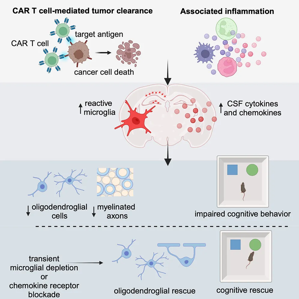 在小鼠中,短暂的微胶质细胞耗竭或 CCR3 化学趋化因子受体阻断可挽救 CAR T 细胞治疗后少突胶质细胞的缺陷,并在注意力和短期记忆功能的行为测试中恢复认知表现。综上所述,这些发现阐明了免疫治疗相关认知障碍的可靶向神经免疫机制。