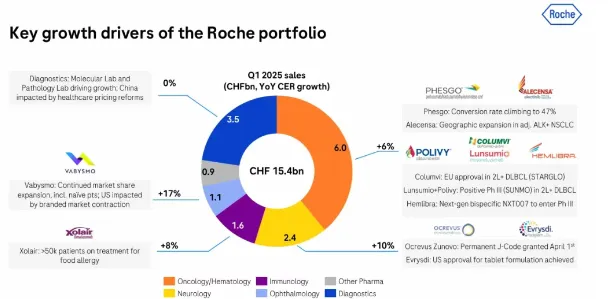 罗氏 2025 年第一季度实现营业收入 154.40 亿瑞士法郎(约 186 亿美元),同比增长 6%。其中制药业务收入 119.49 亿瑞士法郎,同比增长 8%;诊断业务收入 34.91 亿瑞士法郎,与去年 Q1 持平。肿瘤领域营收增长 2%,营收 TOP 产品仍然是 HER2 产品组合(Phesgo、Perjeta 和 Kadcyla)和阿替利珠单抗(Tecentriq)。其中明星产品Phesgo(乳腺癌)全球销售额59.3亿瑞士法郎(+52%),中国市场表现突出。