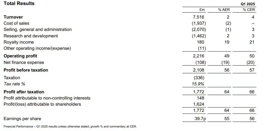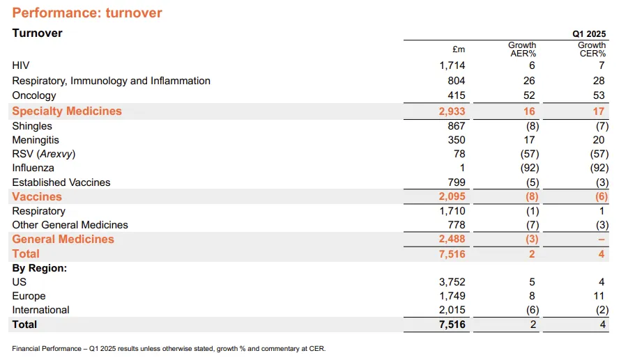 下图为GSK 2025年第一季度的主要财务数据和指标: