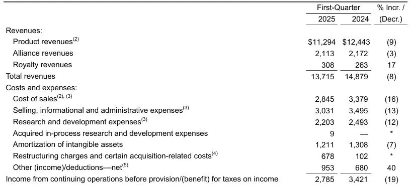 下图为辉瑞2025年第一季度的主要财务数据和指标: