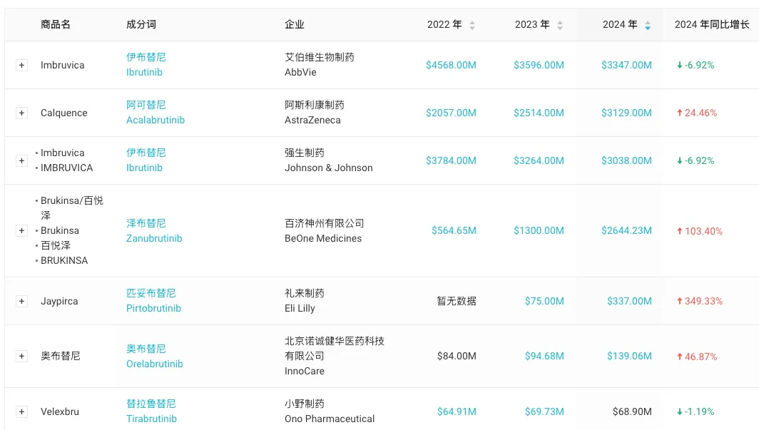 BTK 抑制剂历年销售情况对比