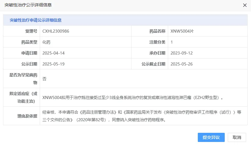 5 月 19 日,CDE 官网显示,信诺维医药的 XNW5004 片拟纳入突破性治疗品种,拟用于治疗既往接受过至少 3 线全身系统治疗的复发或难治性滤泡性淋巴瘤(EZH2 野生型)。