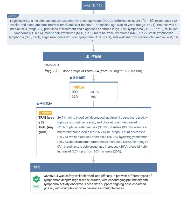 在 2022 年 ASH 大会上,信诺维首次公布该药的 I 期临床试验结果。这是一项开放标签、多中心、单臂、I 期研究,评估 XNW5004 在复发或难治性非霍奇金淋巴瘤(NHL)患者中的安全性、药代动力学、药效学和疗效。